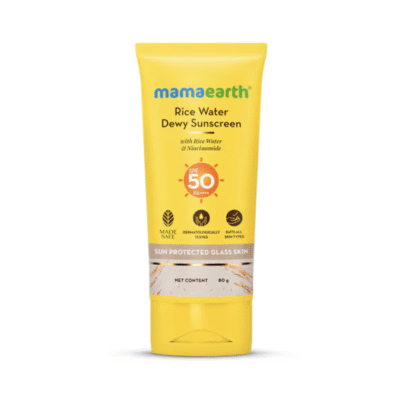 Mama Earth Rice Water Dewy Sunscreen With Rice Water & Niacinamide SPF 50 Sun Protected Glass Skin 80g