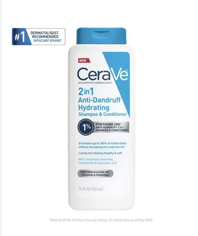 CeraVe 2-in-1 Anti-Dandruff Hydrating Shampoo and Conditioner is clinically tested to help eliminate flakes and reduce itching and irritation.* Formulated with 1% pyrithione zinc, three essential ceramides, niacinamide, and hyaluronic acid, it gently cleanses the scalp and hair. This multitasking dandruff shampoo and conditioner combo was also developed with dermatologists and is suitable for all hair types, including those with curly or color-treated hair. It’s pH-balanced, allergy-tested, and free of phthalates, sulfates, dyes, parabens, and fragrances.
