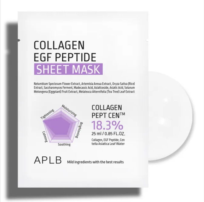 - A sheet mask containing Collagen and EGF Peptide revitalizes dull skin.