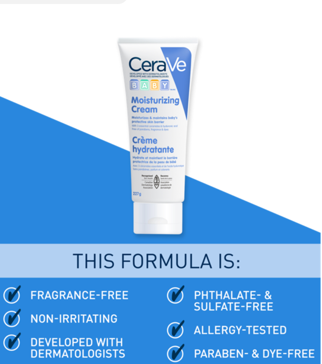 Developed with pediatric dermatologists, CeraVe Baby Moisturizing Cream provides comforting all-day moisture, with three essential Ceramides, Hyaluronic Acid and Dimethicone to moisturize, retain skin’s natural moisture, and maintain baby’s protective skin barrier as it develops. Our fragrance-free, paraben-free and dye-free baby cream is rich in texture and provides your baby’s skin with gentle all day hydration. This moisturizing cream features a cushiony formula that relieves dry skin.