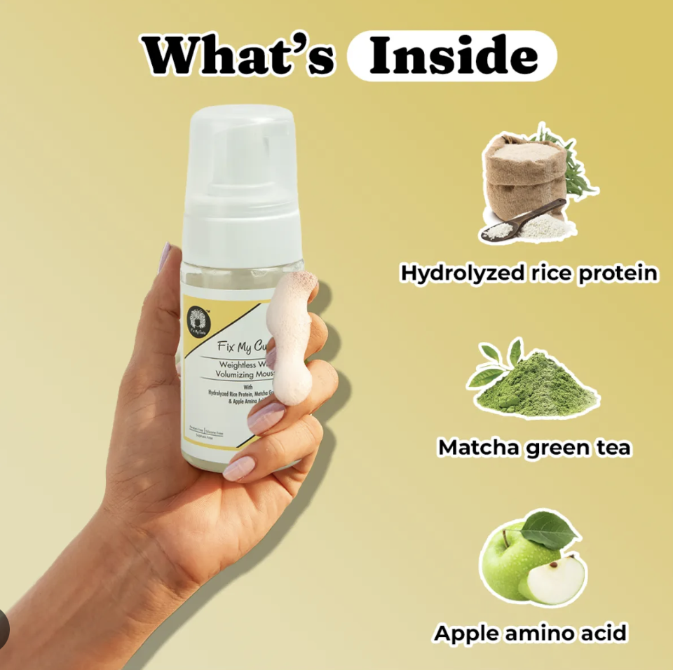 Need a faster styling routine? Meet Fix-My Curls Weightless-Volumizing Mousse, it gives texture to your curls/waves without weighing them down! Enriched with rice protein, matcha green tea and apple amino acids to prevent breakage, aid in shine and definition, all while giving you weightless, voluminous results. This mousse is made to be a one and done, quick to use product for an effortless washday or 3-minute refresh! Simply apply this wet/damp hair like you would a gel, and watch it work its magic