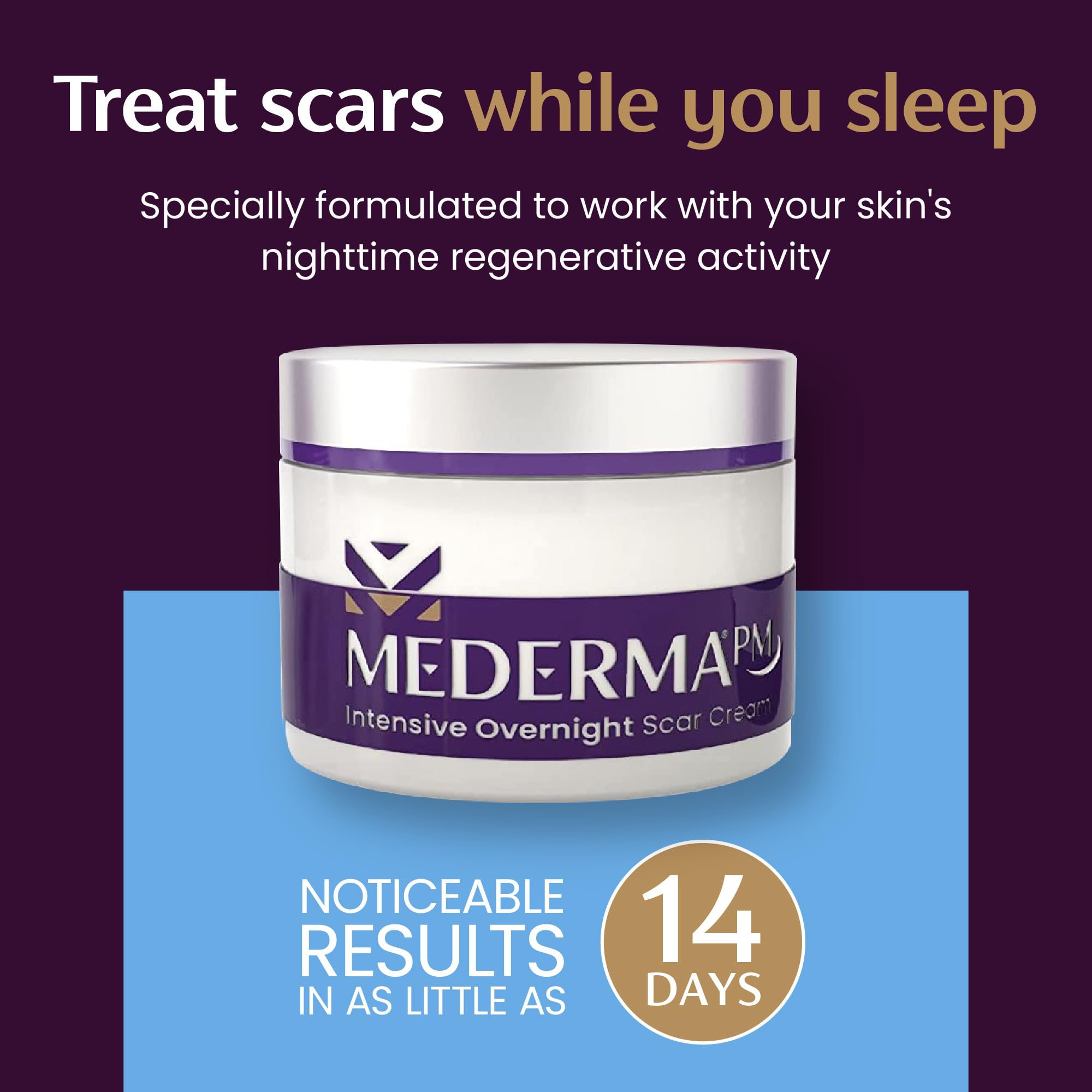 During sleep our bodies work harder to help reverse the damage caused during the day, repairing and regenerating skin cells faster. Mederma® PM Intensive Overnight Scar Cream is formulated to complement this activity with TripeptolTM, a skin nourishing complex with peptides, collagen, and antioxidants to promote healthy looking skin. Plus, the non-greasy formula is safe for sensitive skin. Don’t give your scar a night off. Give it the benefit of overnight care with Mederma® PM Intensive Overnight Scar Cream.Highlights Specifically formulated to work while you sleep Treats scars caused by acne, surgery, burns, and injury See noticeable results in as little as 14 days Helps scars appear softer, smoother, smaller and less visible Triple action formula, paraben-freeVisibly reduce the appearance of scars while you sleep with Mederma PM Intensive Overnight Scar Cream. Simply apply as needed at night to scars from injury, surgery, acne or burns. See noticeable results in as little as 14 days. This intensive nighttime scar treatment cream is clinically shown to improve the color, texture and overall appearance of scars, helping them appear softer, smoother, smaller and less visible. During sleep our bodies work harder to reverse the skin damage caused during the day, repairing and regenerating skin cells at a faster rate.  Mederma PM is specially formulated to complement this nighttime regenerative activity with Tripeptol, a skin nourishing complex with peptides, collagen, and antioxidants to promote healthy looking skin and to help fight free radical damage. Non-greasy formula. Paraben free. The unique triple action formula penetrates beneath the surface of the skin to lock in moisture, help collagen production and renew skin cells. Mederma is the #1 recommended brand of scar treatments among Doctors, Pharmacists, Pediatricians, Dermatologists and Plastic Surgeons (Of U.S. physicians and pharmacists surveyed by an independent market research firm). Give your skin the benefit of overnight care with Mederma.