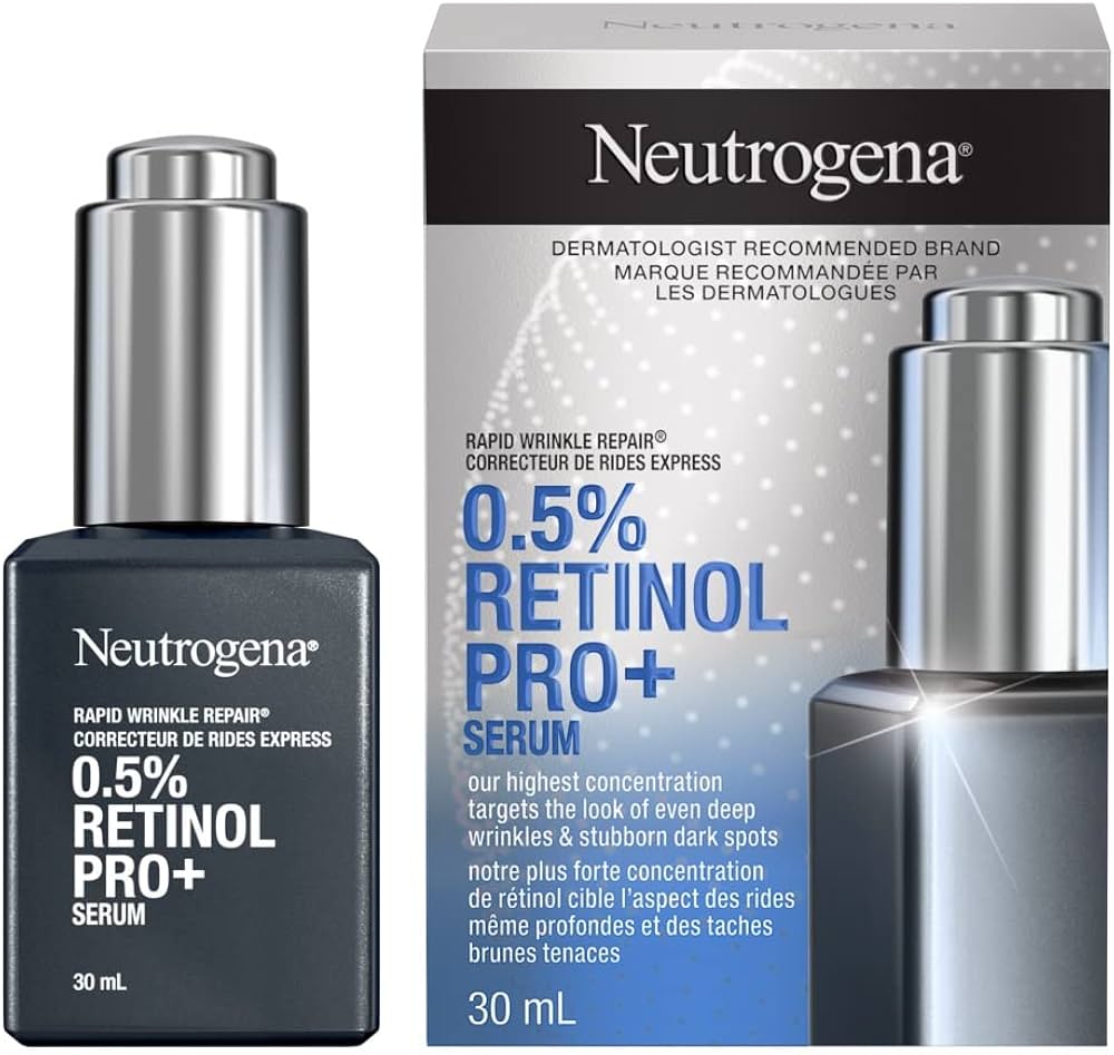Neutrogena Retinol, Rapid Wrinkle Repair 0.5% Pure Retinol Pro+ Serum -reduce the look of fine lines, wrinkles, dark spots, and dullness – 30 mL – Canada- Neutrogena Retinol, Rapid Wrinkle Repair 0.5% Retinol Pro+ Serum is a face serum that reduces the signs of aging. The skin-nourishing serum comes in a 30-millilitre bottle.