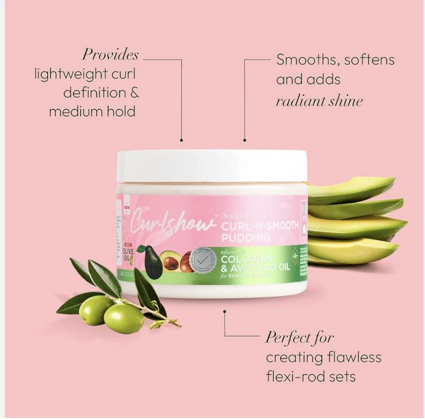 Get flexi-rod sets that give main character energy with our flexible hold Curl-N-Smooth Pudding made to smooth, soften, and add radiant shine to curls, coils, and kinky textures for moisturized, defined, healthy-looking hair. Apply product to damp hair, style as desired, and allow hair to dry.