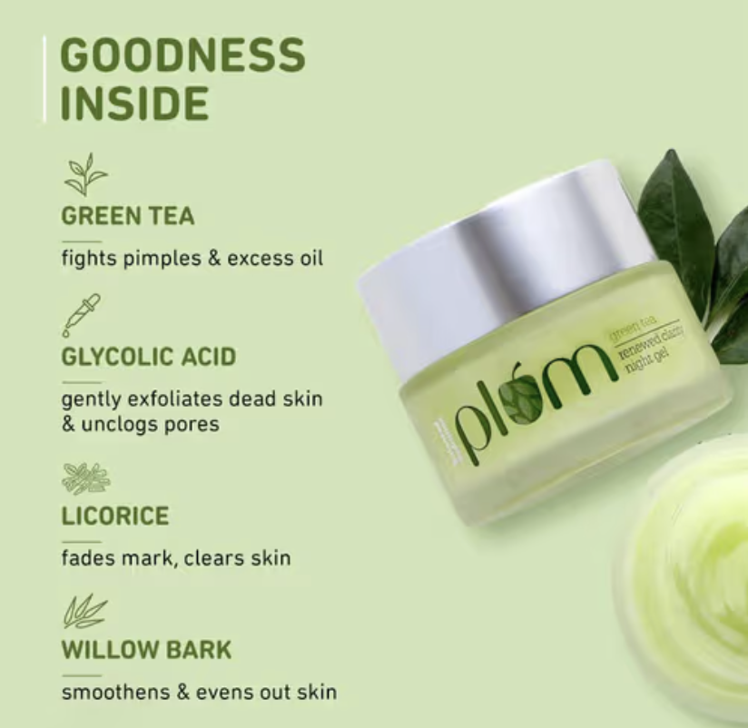 Plum Green Tea Night Gel Cream With Glycolic Acid, Fights Acne For Clear, Oil-Free, Youthful Skin