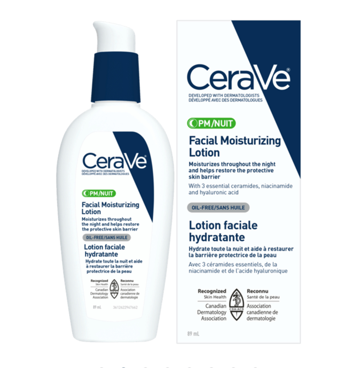 CeraVe PM Facial Moisturizing Lotion features three essential Ceramides, Hyaluronic Acid and Niacinamide to help restore the skin barrier, retain hydration and help sooth the skin. This oil-free, non-comedogenic night cream uses patented time-release MVE Delivery Technology for all-night hydrati