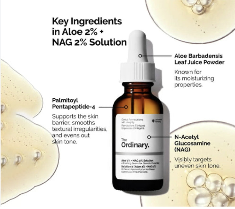 THE ORDINARY ALOE 2% + NAG 2% SOLUTION BLEMISH-PRONE SKIN Aloe 2% + Nag 2% SolutionThe Aloe 2% + NAG 2% Solution is a lightweight, soothing serum designed for those with blemish-prone skin.
