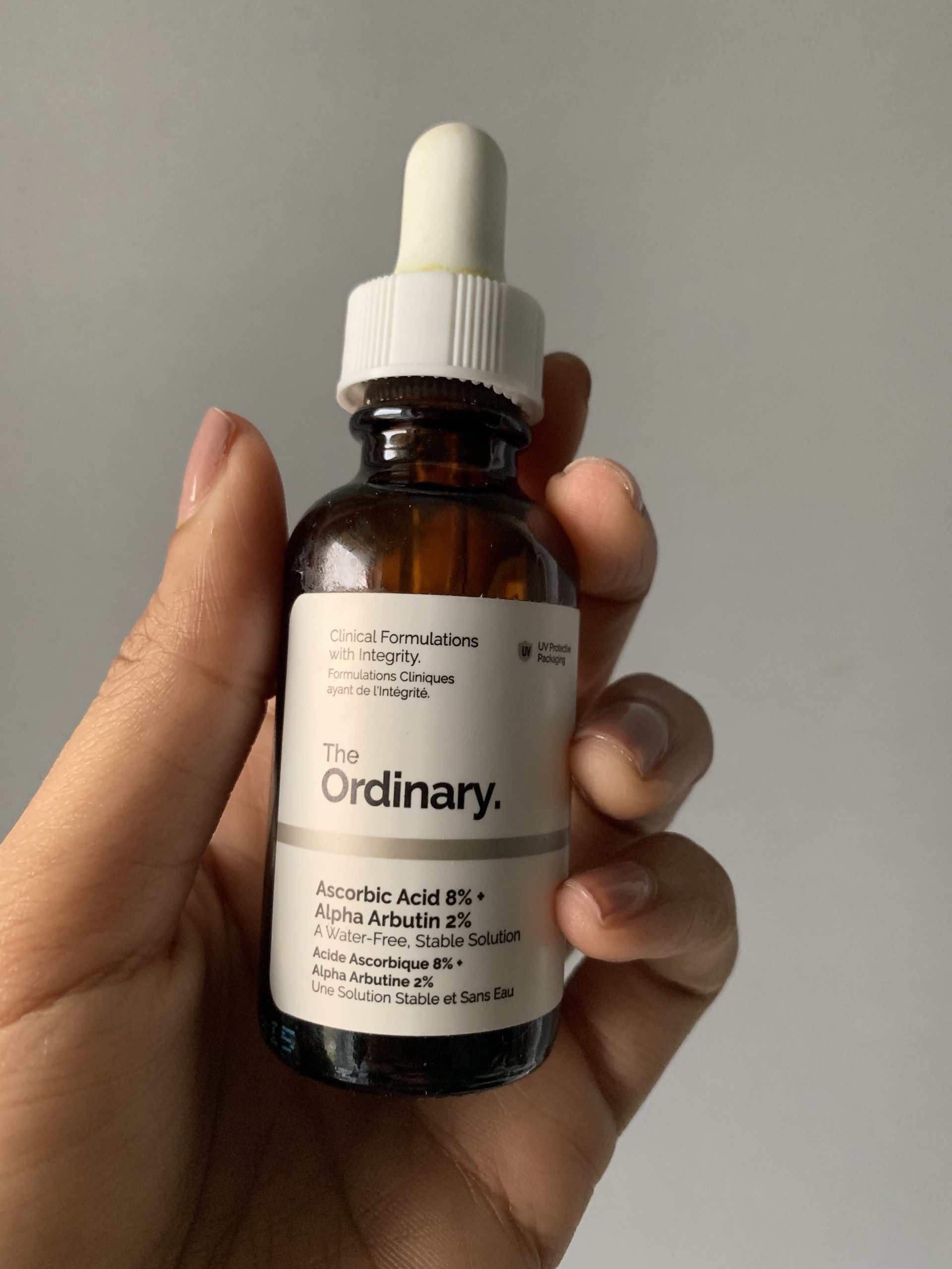 Vitamin C (Ascorbic Acid) is an effective antioxidant that brightens the skin tone and reduces signs of aging. In its pure form, Vitamin C is unstable in water which is why The Ordinary provides it in a water-free formulation.Alpha Arbutin reduces the look of dark spots and uneven skin tone. This formula offers a combination of 8% Ascorbic Acid and 2% Alpha-Arbutin that work together to visibly brighten the look of skin while also targeting the appearance of dark spots and multiple signs of skin aging.HOW TO USEApply a few drops to face in the AM and PM as part of your skincare regimen. Use sun protection in the AM.INGREDIENTSPropanediol, Ascorbic Acid, Alpha-Arbutin.