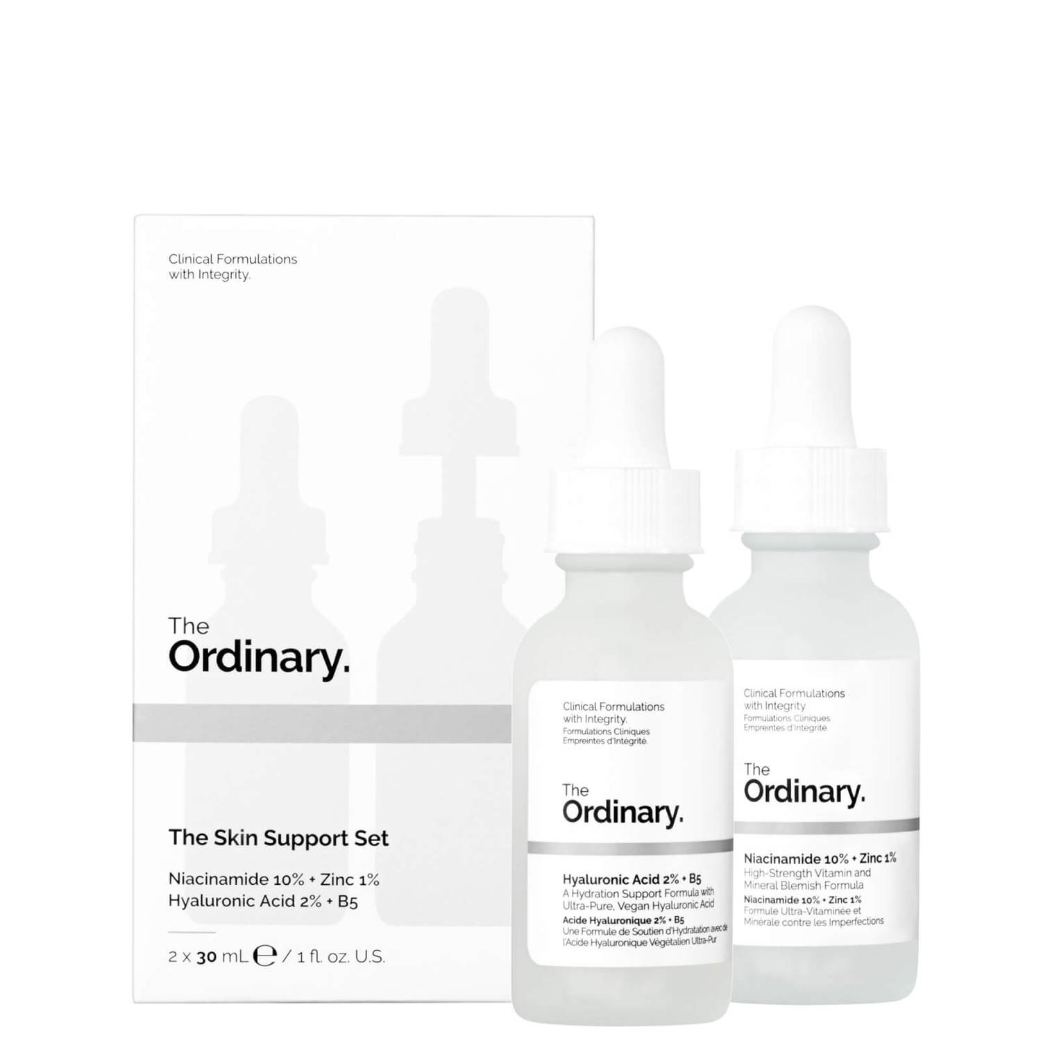 Dull or dry skin, problematic, stressed-out skin getting you down? Give your skin the support it’s craving with the Skin Support Set from The Ordinary’s results-driven ranks.Featuring three types of hyaluronic acid (at low, medium and high molecular weights) The Ordinary’s Hyaluronic Acid 2% + B5 offers serious skin smoothing – at a surprisingly small price. Penetrating the skin to reach its deeper layers to deliver lasting hydration and visible moisture retention so that skin looks smoother, softer and healthier. Harnessing the (anything but ordinary) power of niacinamide and zinc, the potent Niacinamide 10% + Zinc 1% is perfect for combatting blemishes, enlarged pores and uneven skin tone. A must-have for battling breakouts, this potent serum regulates sebum production to minimise the appearance of pores and targets dull skin, keeping your complexion clear, calm and collected. Superlative skin improvers, your skin will thank you for a little face time with this duo. how to use -Hyaluronic Acid 2% + B5: Apply a few drops to face in the morning and evening before cream.Niacinamide 10% + Zinc 1%: Apply to entire face morning and evening before heavier creams. ingredientsHyaluronic Acid 2% + B5: Aqua (Water), Sodium Hyaluronate, Sodium Hyaluronate Crosspolymer, Panthenol, Ahnfeltia Concinna Extract, Glycerin, Pentylene Glycol, Propanediol, Polyacrylate Crosspolymer-6, Ppg-26-Buteth-26, Trisodium Ethylenediamine Disuccinate, Citric Acid, Ethoxydiglycol, Caprylyl Glycol, Hexylene Glycol, Ethylhexylglycerin, Phenoxyethanol, Chlorphenesin.Niacinamide 10% + Zinc 1%: Aqua (Water), Niacinamide, Pentylene Glycol, Zinc PCA, Dimethyl Isosorbide, Tamarindus Indica Seed Gum, Xanthan gum, Isoceteth-20, Ethoxydiglycol, Phenoxyethanol, Chlorphenesin.