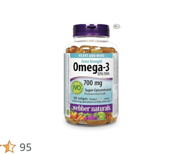 Webber Naturals Omega-3 700 mg Extra Strength, 100 Clear Enteric No Fishy Aftertaste Softgels, Supports Cardiovascular Health and Brain Function- Supports Cardiovascular Health and Brain Function: Omega-3 fatty acids are essential in supporting cardiovascular and brain health. They lower triglyceride levels, support healthy brain function, help fight inflammation, as well as reduce painful symptoms of rheumatoid arthritis and other inflammatory conditions