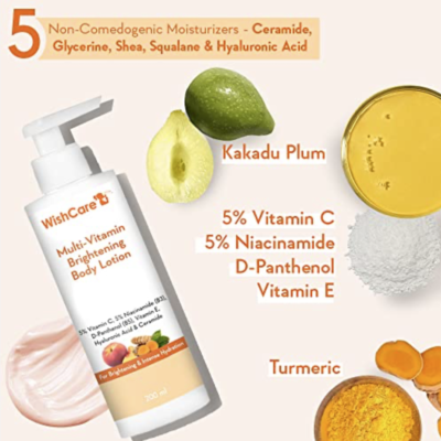 WishCare Multi-Vitamin Brightening Body Lotion – 5% Vitamin C, 5% Niacinamide(B3), Panthenol(B5), Vitamin E, Turmeric & Kakadu Plum – For Men & Women – 200 Ml